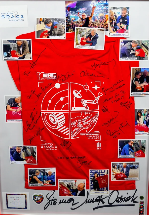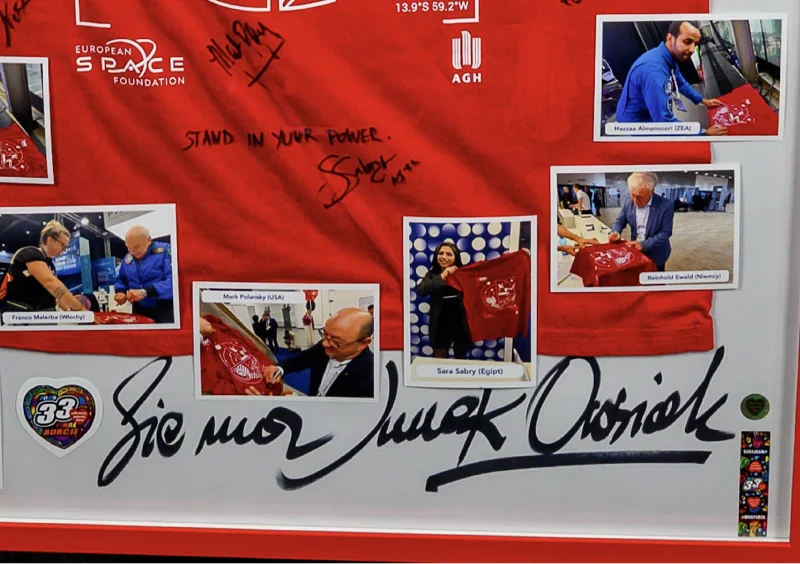 How is it possible that all these amazing people signed a shirt for the Great Orchestra of Christmas Charity? It’s all thanks to the hard work of the amazing team at the European Space Foundation during the International Astronautical Congress in Milan (2024), documented in the framed photos. It is partly thanks to the work of this team that the International Astronautical Congress (IAC) will be held in Poland in 2027!